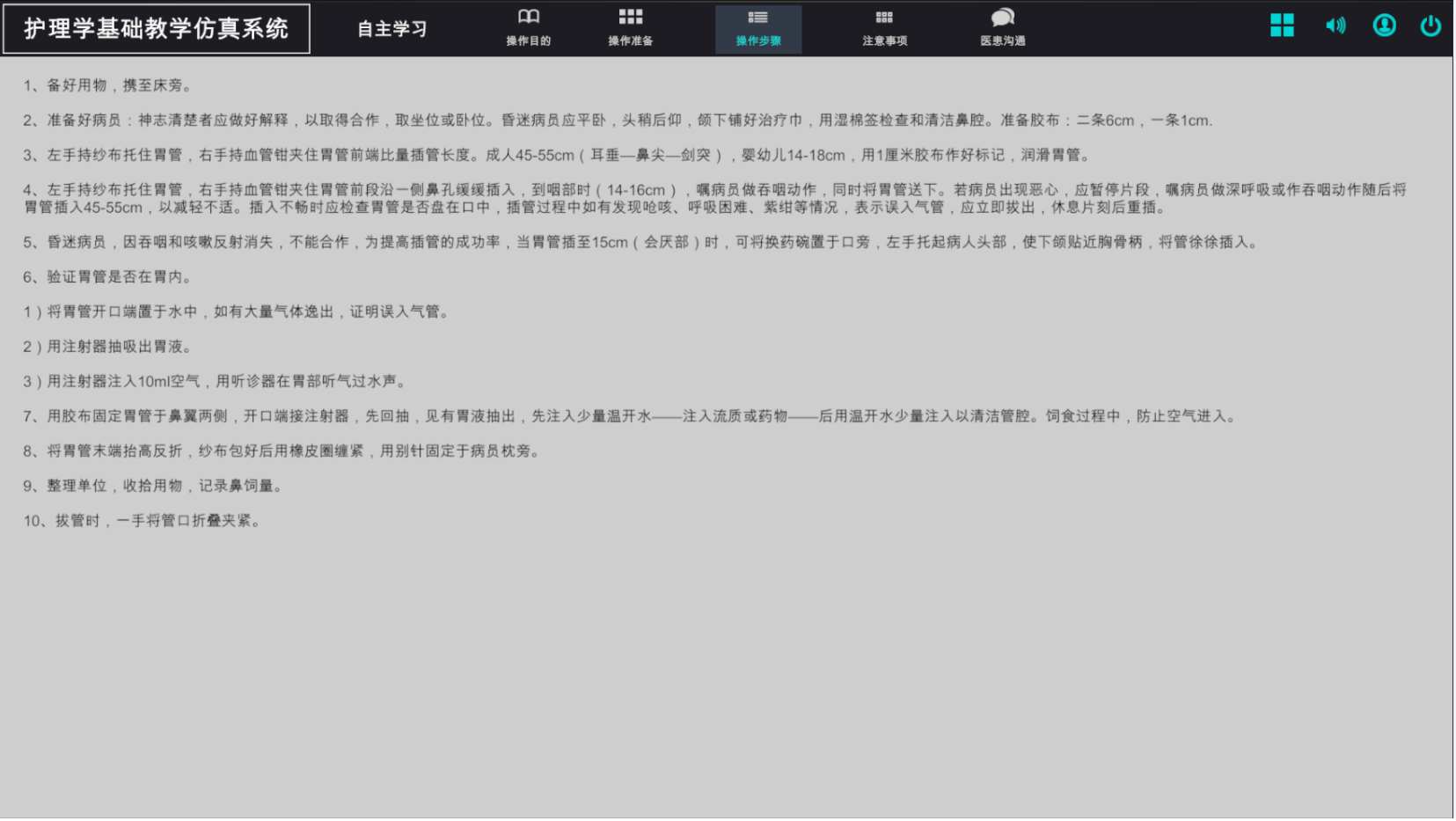 護理虛擬仿真系統-自主學習模塊:解決從理論知識點到實際生產環境中應用認識問題。配套相關理論知識,使學員對理論學習內容有整體把握。對關鍵操作步驟梳理讓學員思路更清晰。把每個實訓科目的操作目的、操作準備、操作步驟、注意事項、醫患溝通、實操視頻等內容進行歸納總結。學員可以進行自主學習,對理論知識進行系統化梳理。