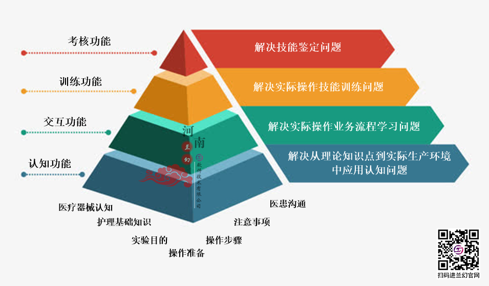 護理虛擬仿真系統解決的問題:1.認知功能——解決從理論知識點到實際生產環境中應用認識問題。2.交互功能——解決實際操作業務流程認知學習的問題。3.訓練功能——解決實際操作技能訓練的問題。4.考核功能——解決技能鑒定問題。